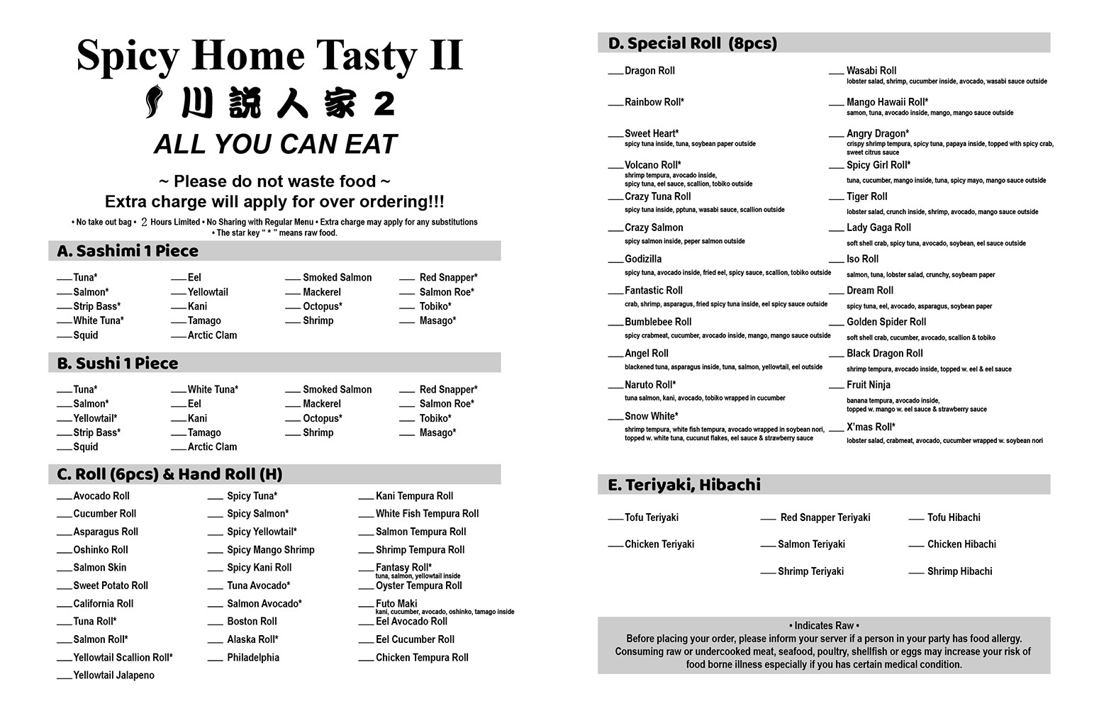 All You Can Eat Menu